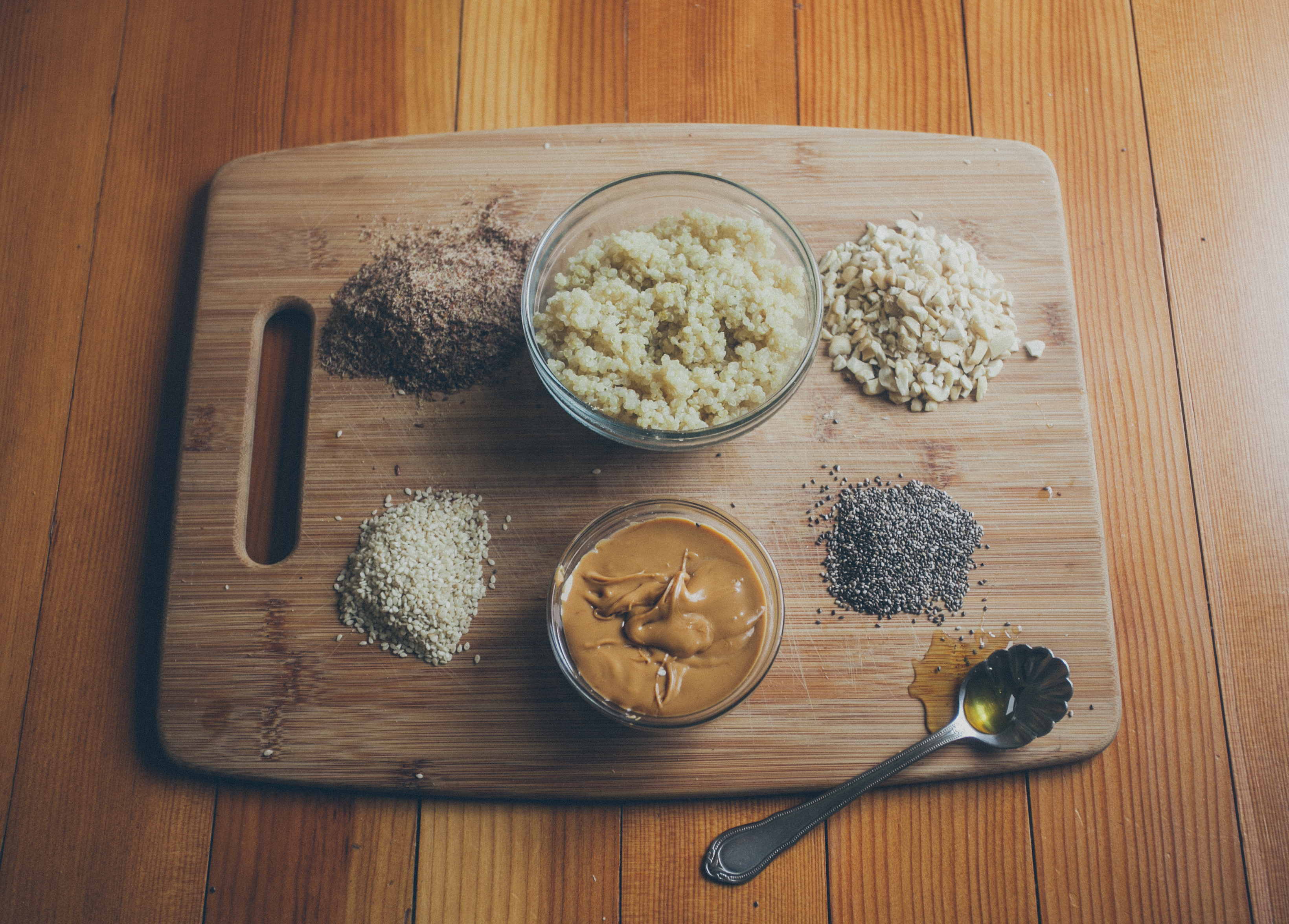 1/4 cup of each, peanut (or almond) butter, honey, ground flax seeds, roasted chopped cashews.