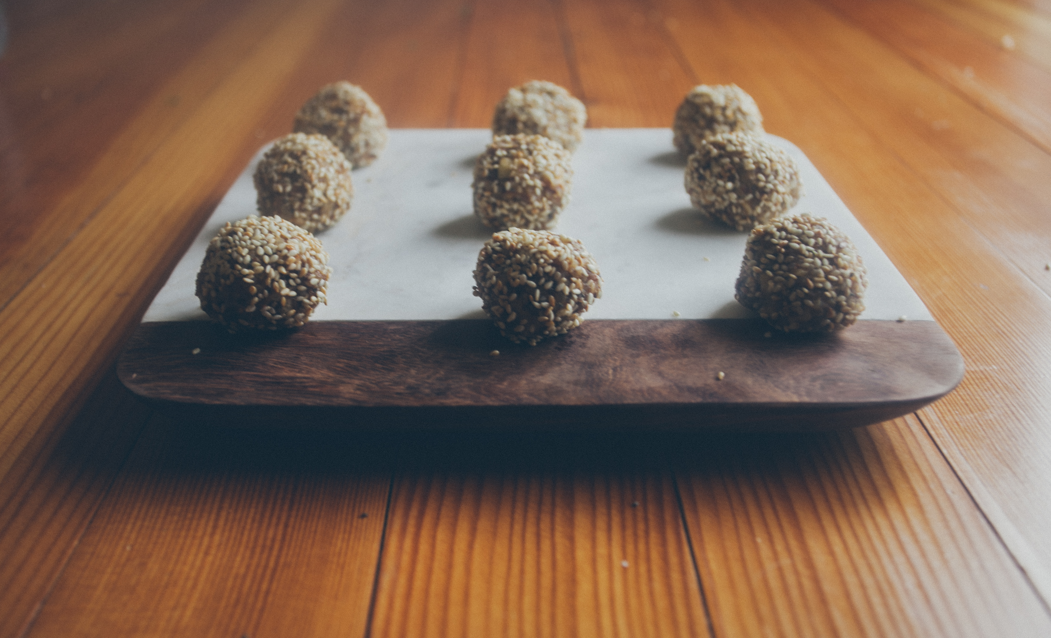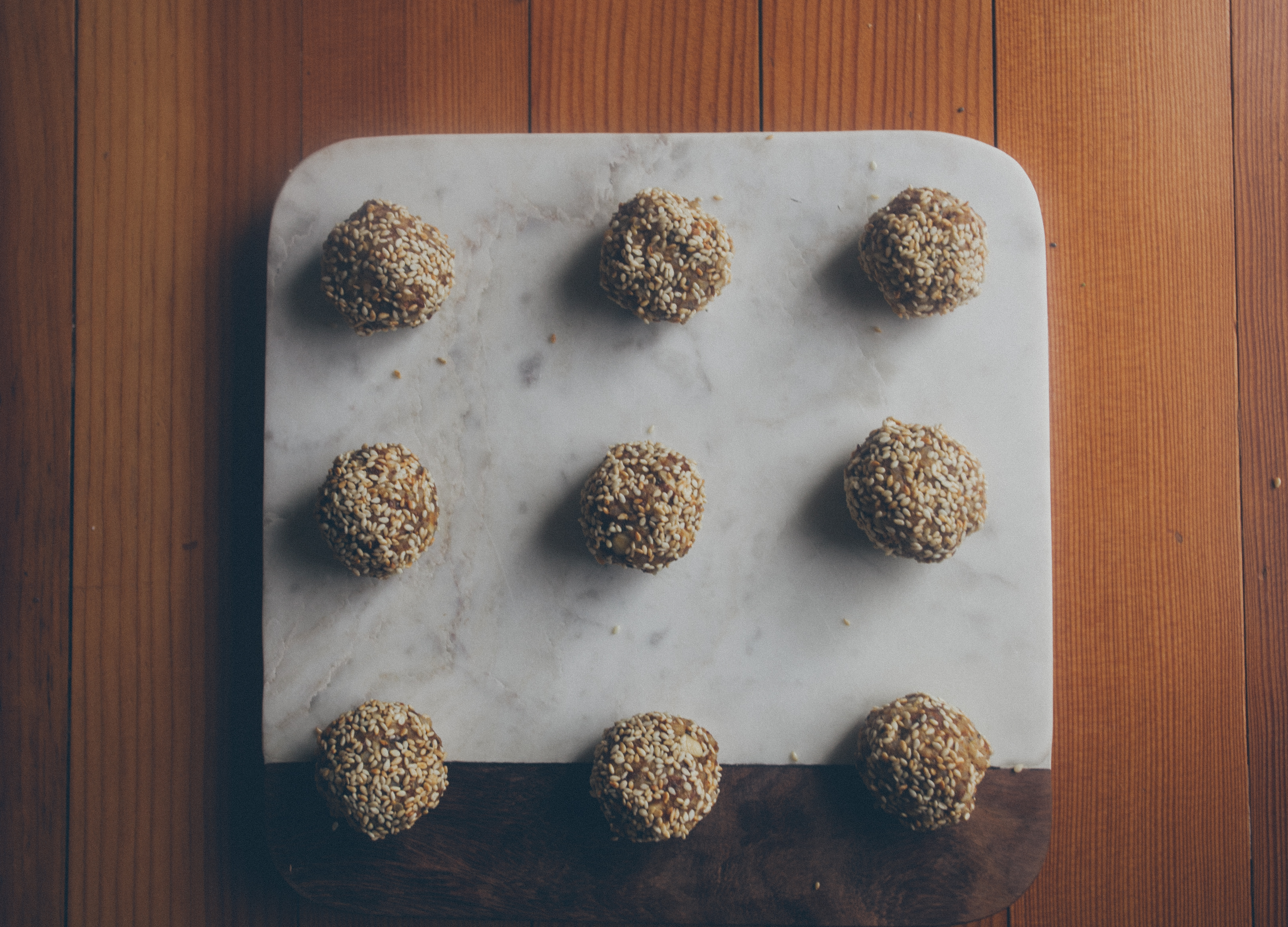 mix ingredients together, (mix the honey and peanut butter together before adding to the rest) Form balls, roll in toasted sesame seeds. Freeze 20 min and eat. will last in fridge 3-5 days.