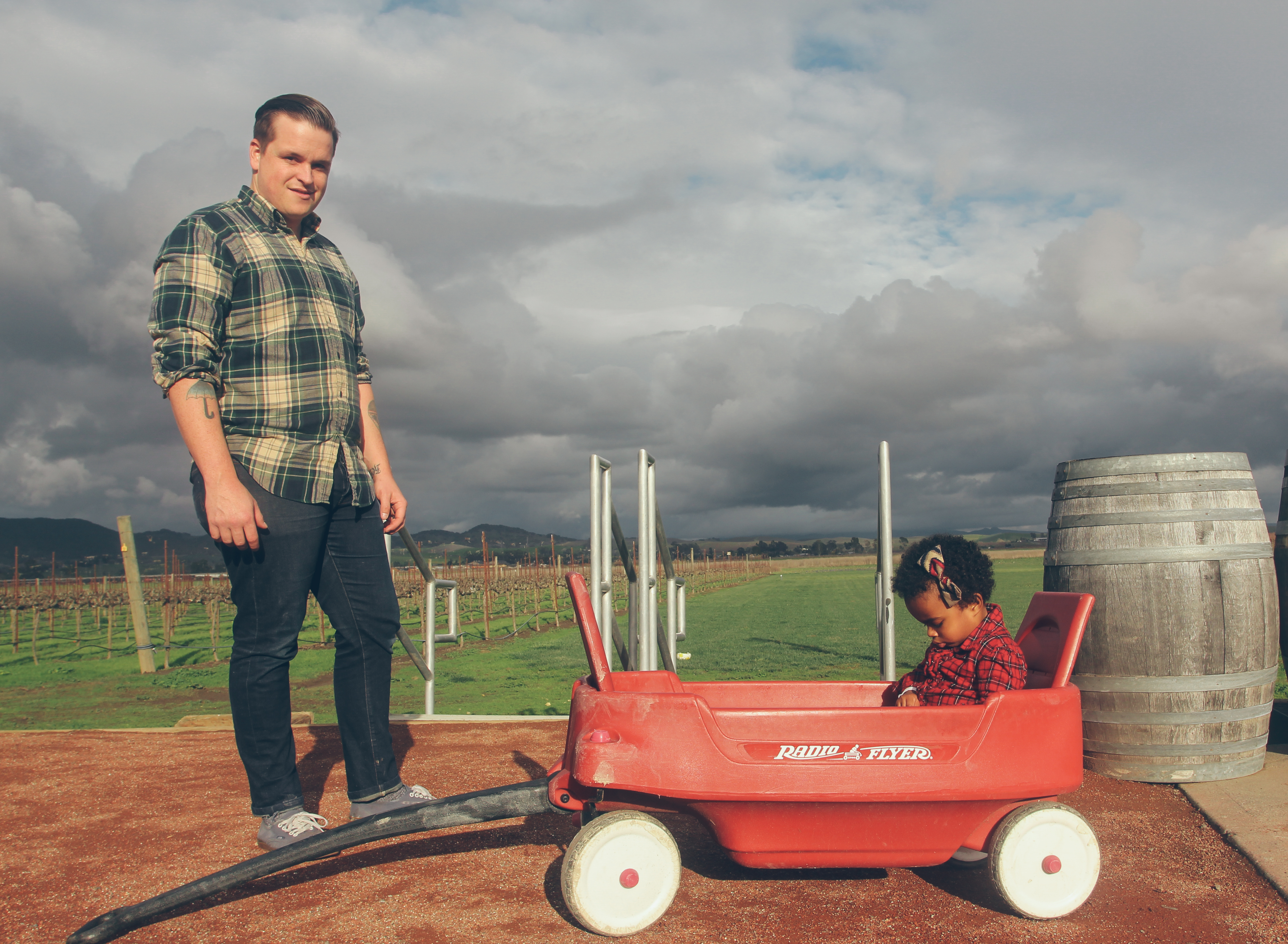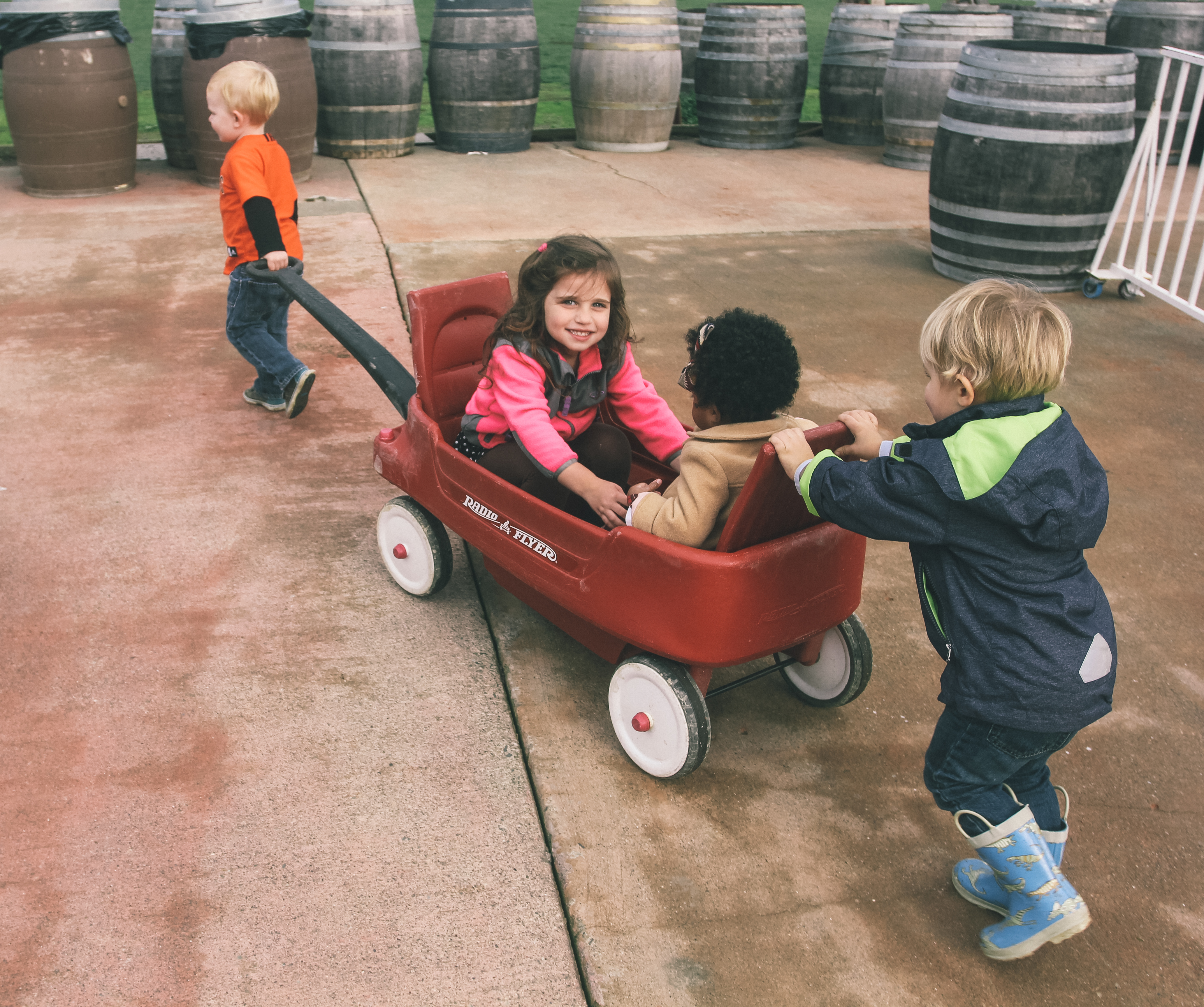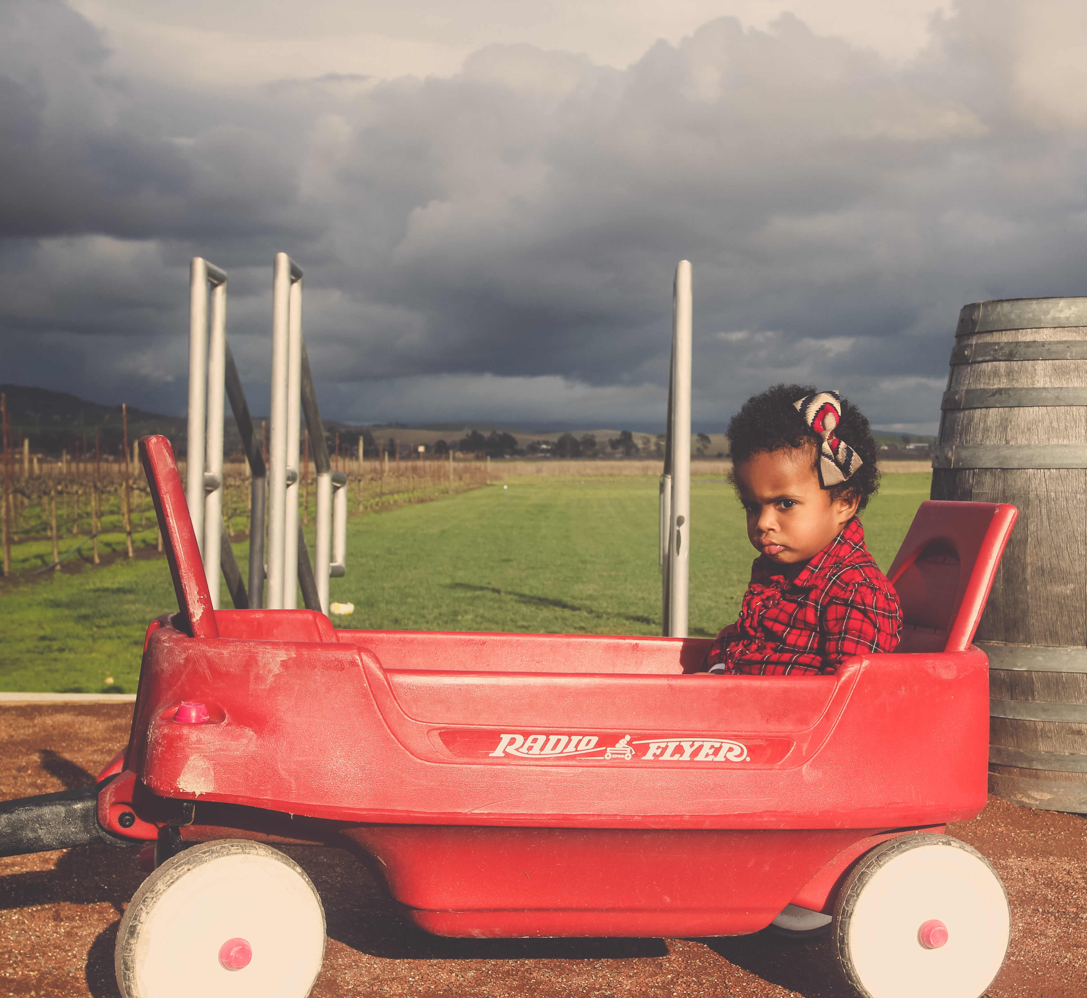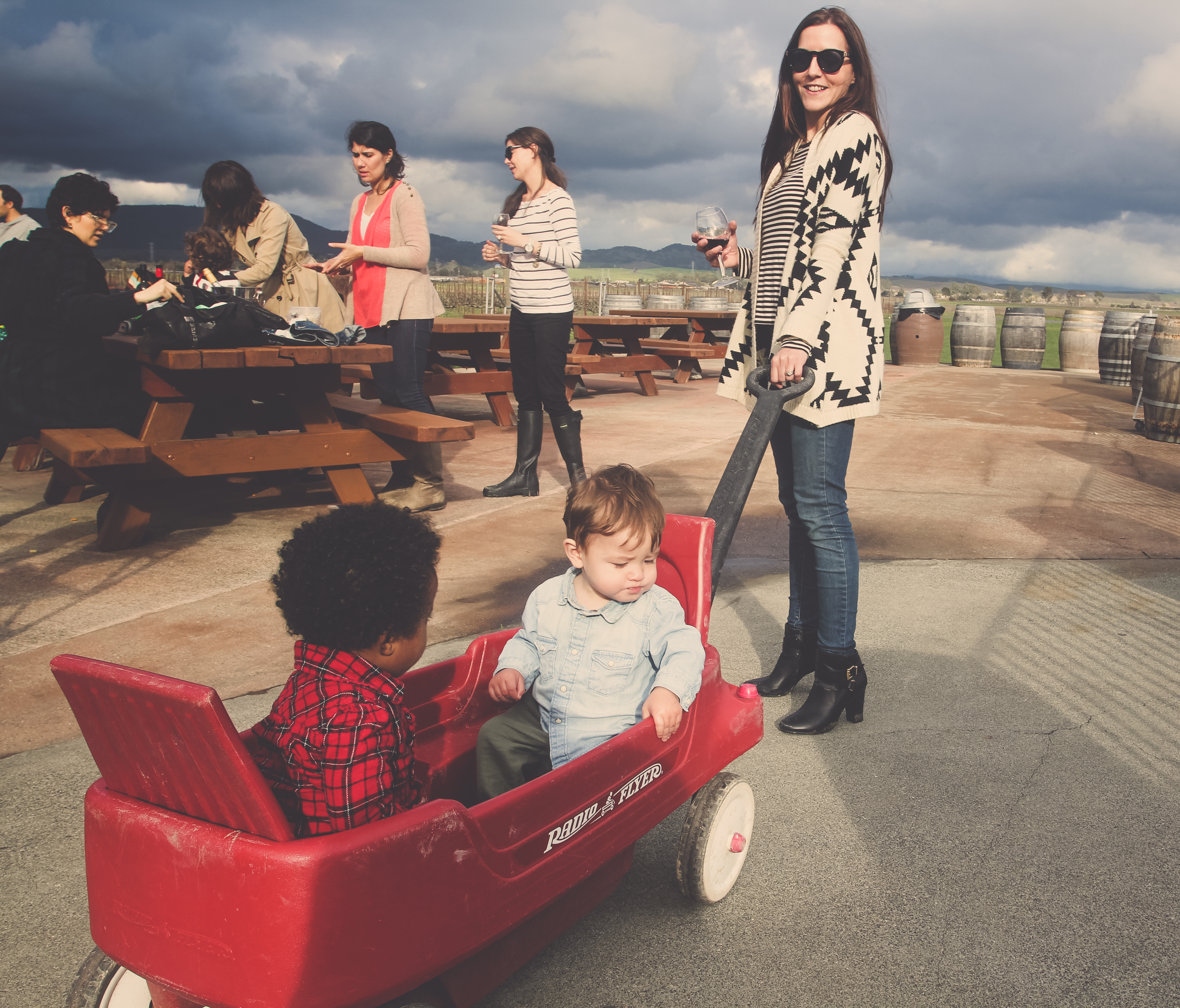 We try to get together as much as we can, and we always enjoy an escape from the city. Last weekend some of us made our way to Napa. We thought there would be sunny skies, but of course there weren’t. Instead the sky was undecided, alternating orange and blue behind approaching thunder clouds, full of the nervous anticipation of rain. But that didn’t stop us. We still had a wonderful day and the kids had so much fun. We took them to Traintown, which is a small amusement park with a train that travels through 4 miles of bridges, tunnels, and stops at a small petting zoo with a miniature town. They all loved it. After that we went to Larson family winery where we shared a few bottles of wine while the kids ran around, and played in the mud. One of the things I love about these friends is that most of us have kids, and we all help each other out, even the ones without. We are always quick to grab the child who is about to fall down, we are ready to hold the crying baby so Mom can have a break, and we are always eager to offer a hug and a high five to the happy, or sad child. M is surrounded by so many amazing “aunties” and “uncles”, and they have shown her so much love. We are truly blessed. It was a wonderful day spent with wonderful people.