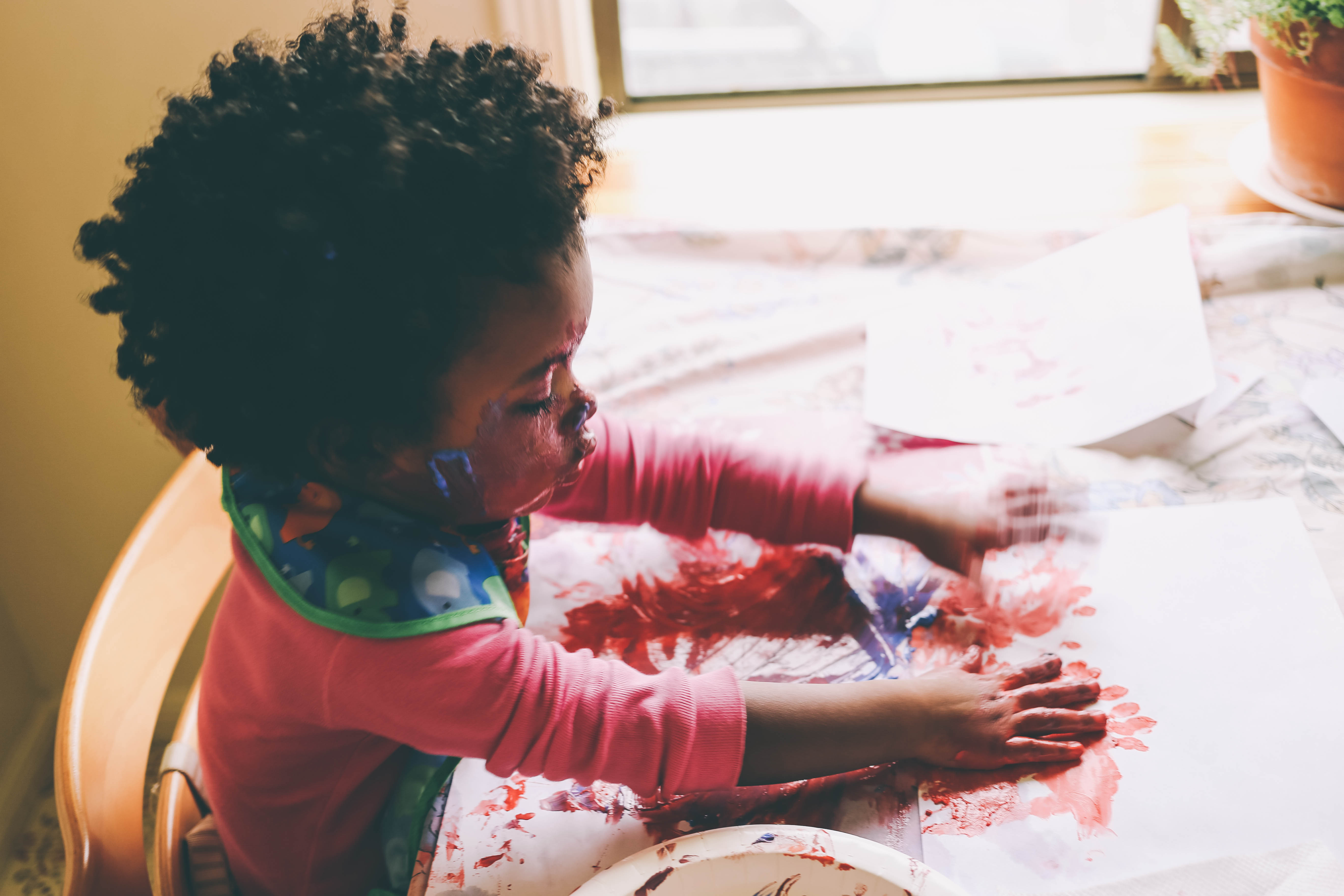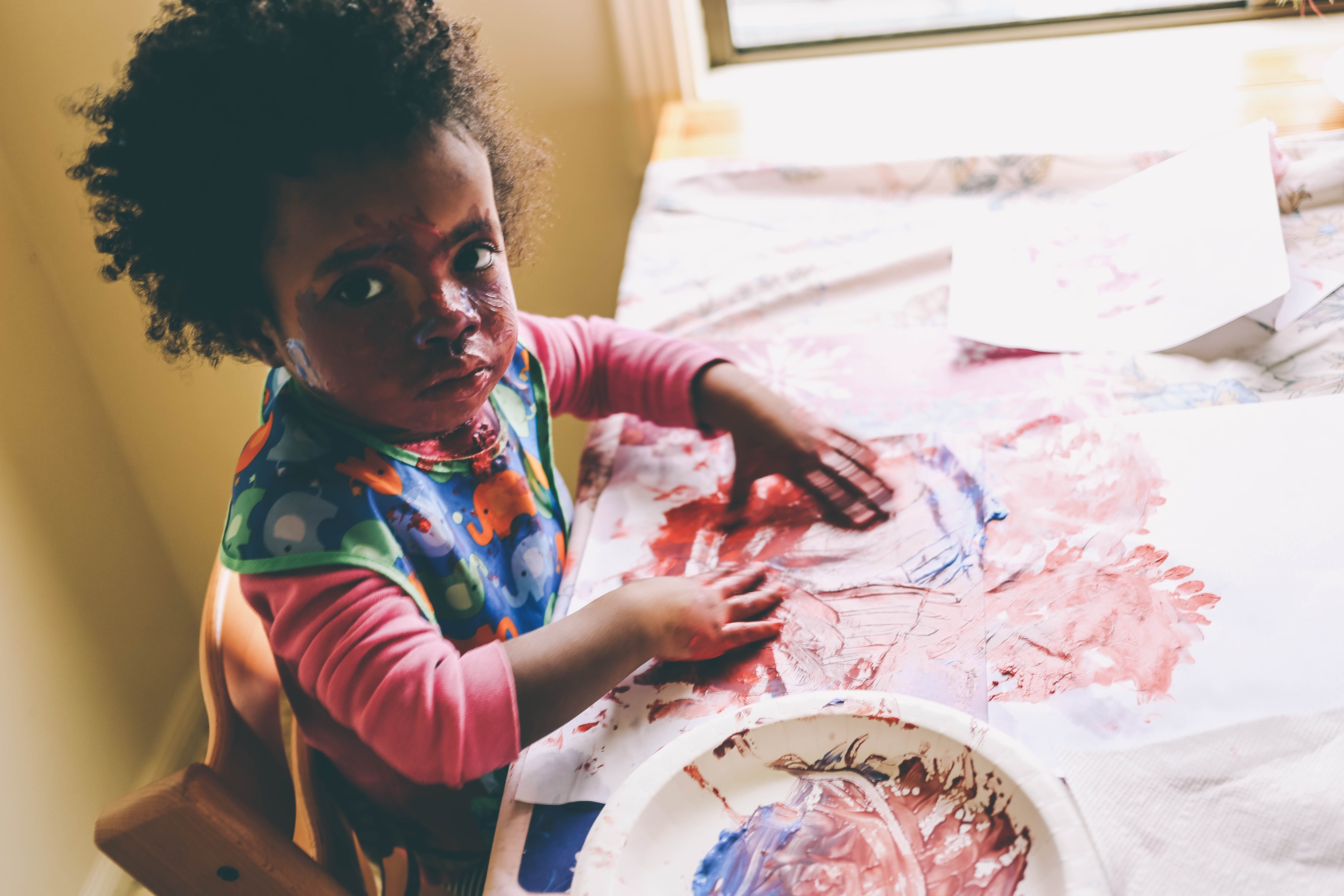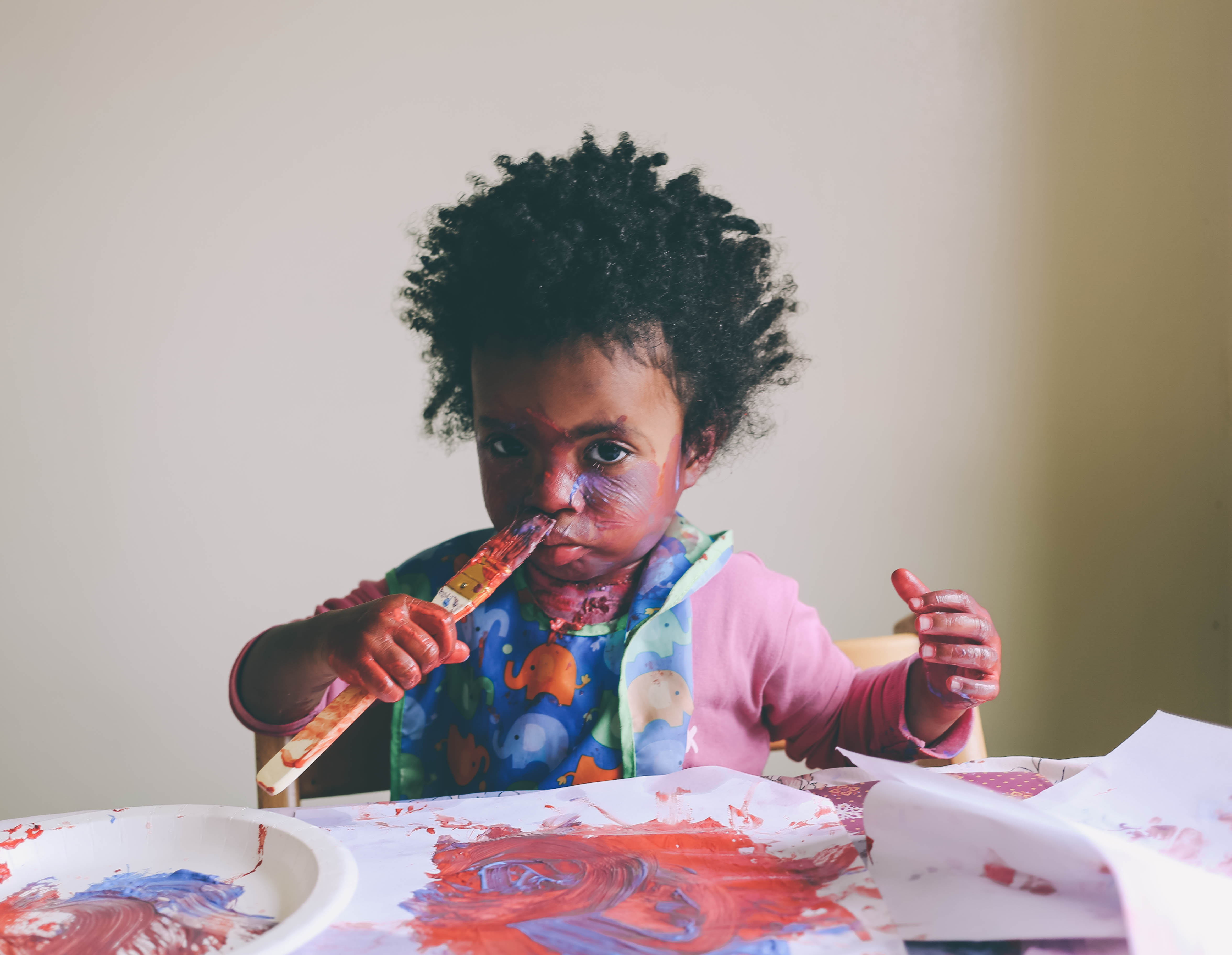 I try to do a craft or art activity with Mari a few times a week (I wanted to say everyday, because that was my goal, but lets be honest, that doesn’t happen everyday. Unless you consider smashing and smearing her food all over her place mat, or throwing her soggy cereal across the room to see if it will stick to the wall, then yes we do art everyday) . She loves it, probably because of how messy I let her get. And I love it, because I know its one of the best ways for her to learn and strengthen her mind and the creativity in her. I have always done lots of hands on activities and sensory play with her because I know it is so good and vital for the development of her little brain and fine motor skills. This day, we did finger painting. I placed paper, paint and different types of brushes in front of her and let her go to town, and she did…mostly on her face.